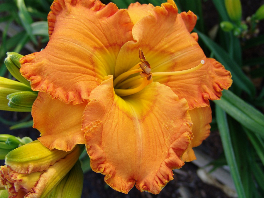 Рассада лилейника Оранж Нассау (Orange Nassau) дает возможность украсить свой палисадник сказочно красивыми цветами насыщенных оттенков. Растение цветет довольно рано, крупными бутонами персико-оранжевого цвета с огромным золотистым глазком и лимонным горлышком. Поверхность лепестков немного смятая, а их края сильно гофрированные.
