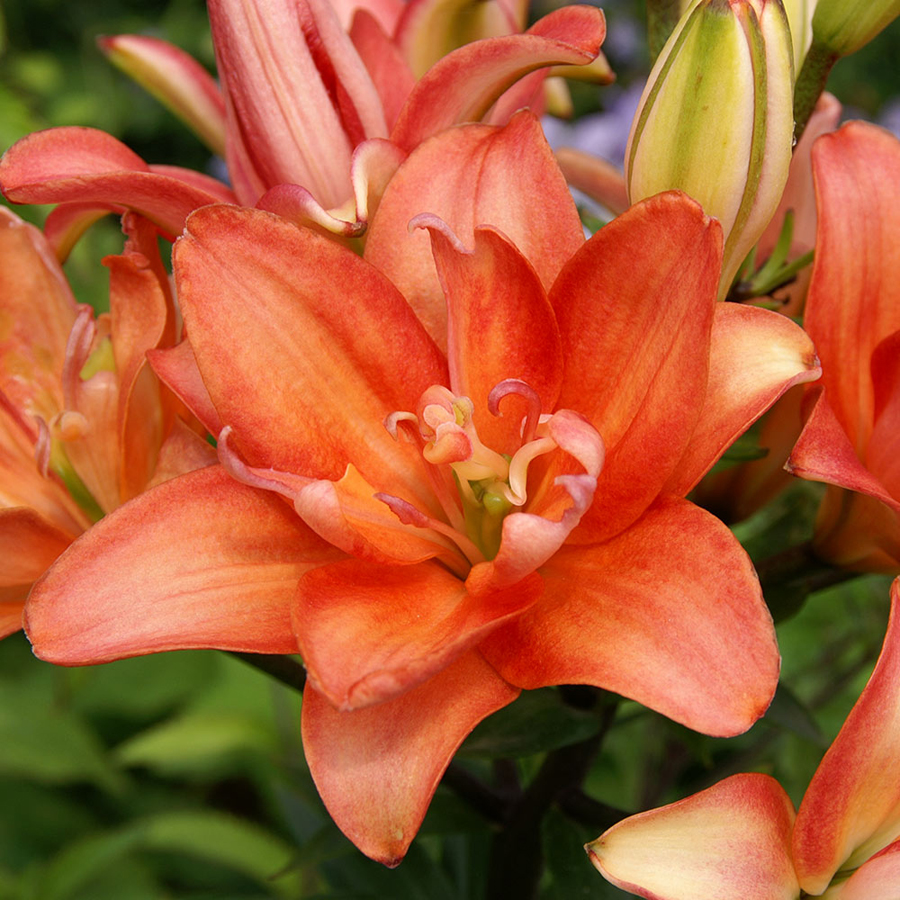 Саженцы и рассада лилии азиатской махровой Себ Латте (Lilium asiatic Ceb Latte) - редкий многолепестковый сорт. Растение не очень крупное, невысокий стебель поднимается не выше 70 см, на нем располагается по несколько средних цветков. Экзотичности добавляет специфическая лососевая расцветка. Белая размытая полоса на волнистых лепестках создает ощущение пышности.